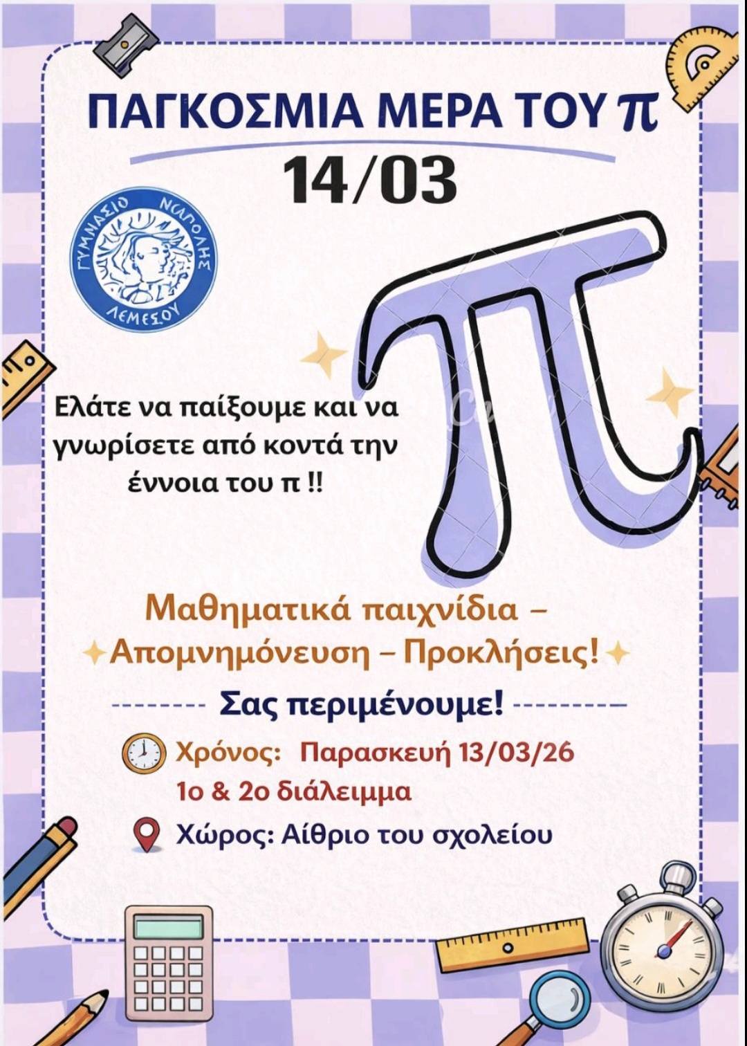 Την Παρασκευή 13 Μαρτίου 2026 το σχολείο μας γιόρτασε την Παγκόσμια Ημέρα της σταθεράς π, μέσα από μια σειρά εκπαιδευτικών και διαδραστικών δραστηριοτήτων που διοργανώθηκαν από την ομάδα των Μαθηματικών σε συνεργασία με την ομάδα των Φυσικών.